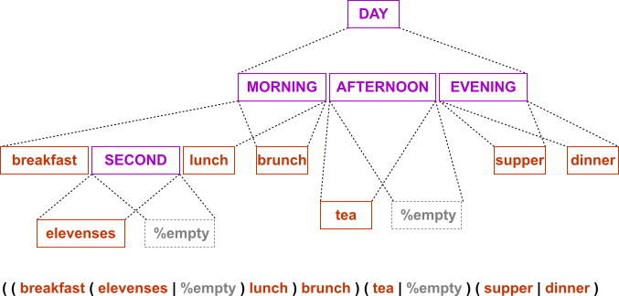 CFG grammar is defined starting from topmost nonterminal (here DAY) down to level of terminal symbols. Alternative productions for nonterminals like MORNING result in multiple ways of expanding grammar down the tree. Possible grammar expansions are shown on Fig. 12.